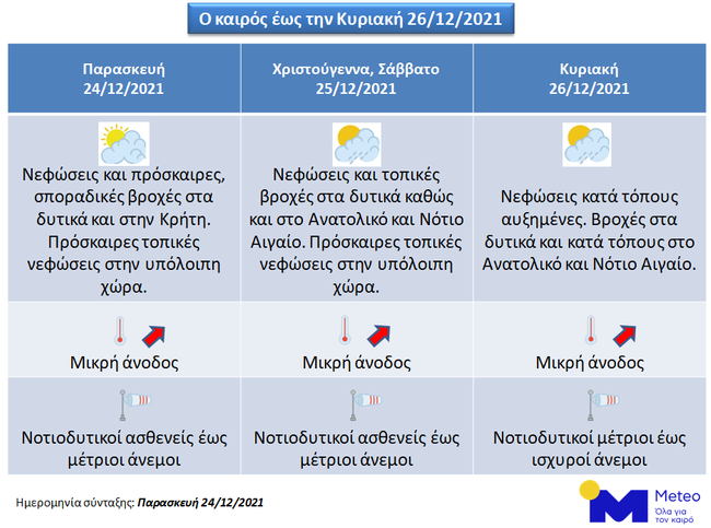Πιο αναλυτικά, Ανήμερα των Χριστουγέννων, Σάββατο 25/12 και κυρίως την Κυριακή 26/12 στα δυτικά ηπειρωτικά, στο Ιόνιο και σε τμήματα του Ανατολικού και Νοτίου Αιγαίου θα σημειωθούν βροχοπτώσεις ενώ στην υπόλοιπη χώρα θα υπάρχουν πρόσκαιρες τοπικές νεφώσεις. Τα φαινόμενα στο Αιγαίο θα είναι μικρότερης διάρκειας και έντασης. Η ορατότητα στα ηπειρωτικά κατά τις βραδινές ώρες και έως το πρωί θα είναι τοπικά περιορισμένη ενώ οι συγκεντρώσεις σκόνης στην ατμόσφαιρα την Κυριακή 26/12 θα είναι αυξημένες.