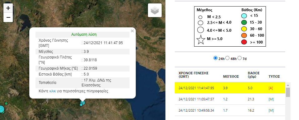 Το επίκεντρο του σεισμού εντοπίζεται 17 χιλιόμετρα δυτικά - νοτιοδυτικά της Ελασσόνας, ενώ το εστιακό του βάθος είναι στα 5 χιλιόμετρα.