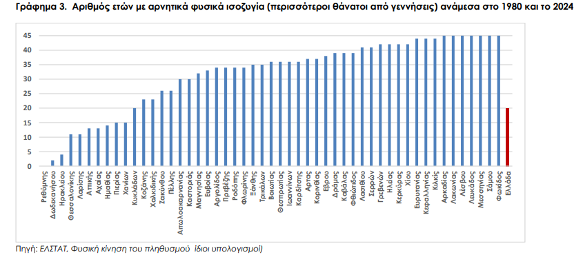 Εξετάζοντας την περίοδο 1980 -2024 στους 51 νομούς της χώρας, διαπιστώνεται ότι, ενώ σε εθνικό επίπεδο καταγράφονται περισσότεροι θάνατοι από γεννήσεις στα 20 από τα 45 εξεταζόμενα έτη, σε περιφερειακό επίπεδο έχουμε 16 νομούς στους οποίους καταγράφονται από το 1980 ως και το 2024 περισσότεροι θάνατοι από γεννήσεις για 41 ή και 45 έτη.