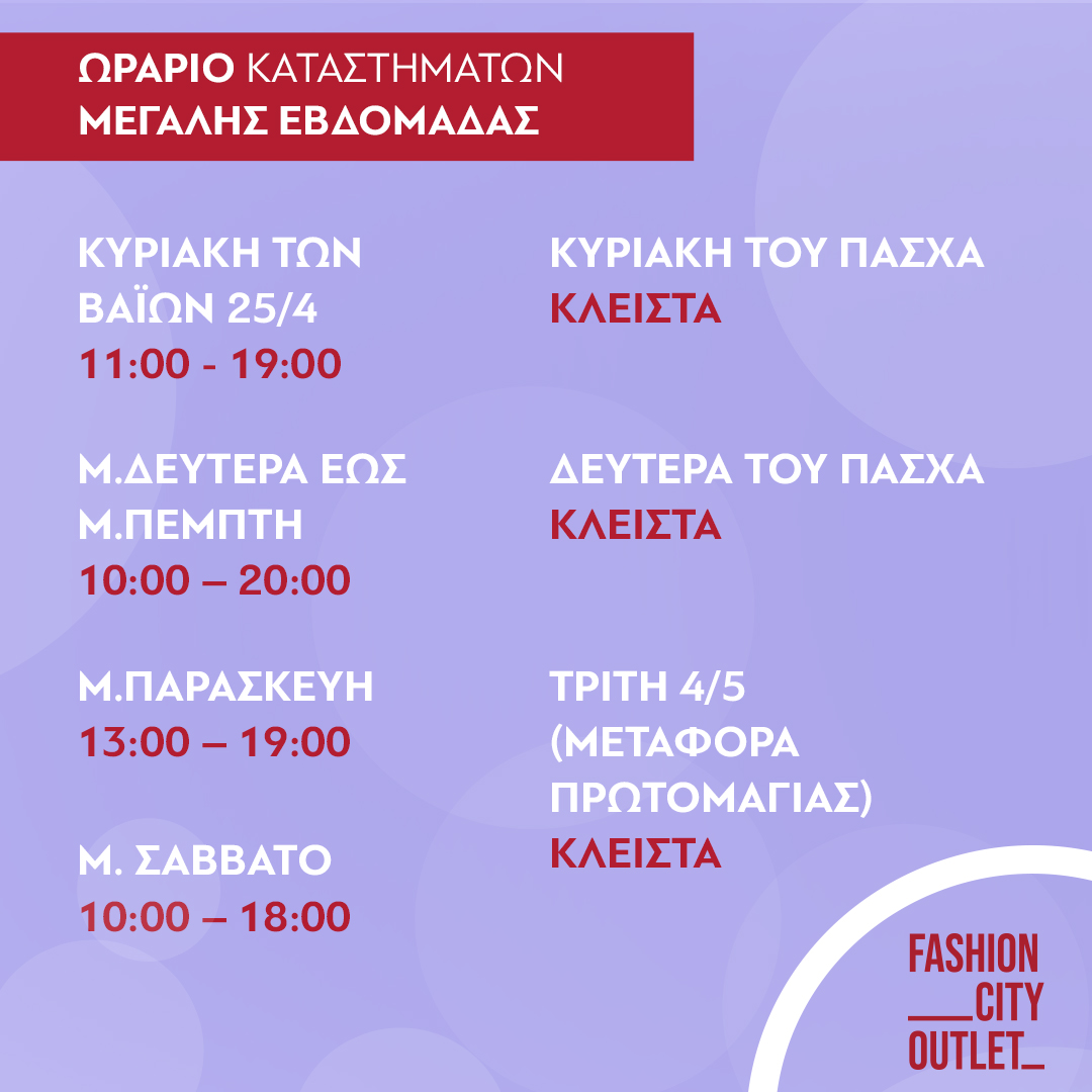 Τα καταστήματα του Fashion City Outlet με την υπηρεσία Click Inside συνεχίζουν να υποδέχονται τους καταναλωτές για τις Πασχαλινές αγορές τους.