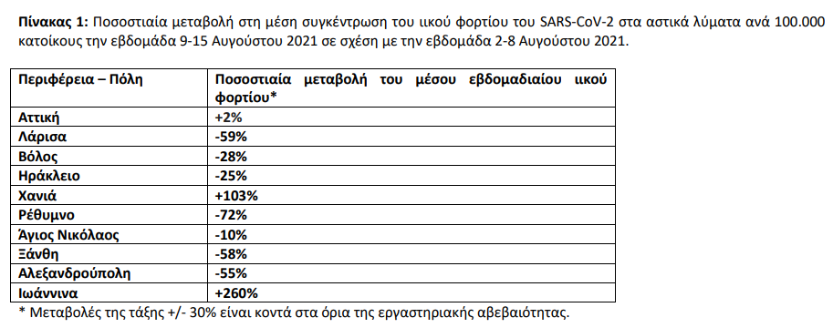 Την εβδομάδα 9 έως 15 Αυγούστου 2021, παρατηρήθηκαν πτωτικές ή σταθεροποιητικές τάσεις, σε σχέση με την εβδομάδα 2 έως 8 Αυγούστου 2021, στο μέσο εβδομαδιαίο ιικό φορτίο του SARS-CoV-2 στα αστικά λύματα των οκτώ από τις δέκα (8/10) περιοχές που ελέγχθηκαν από το Εθνικό Δίκτυο Επιδημιολογίας Λυμάτων του ΕΟΔΥ.