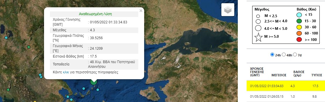Σεισμική δόνηση μεγέθους 4,3 βαθμών της κλίμακας Ρίχτερ σημειώθηκε στις 04:33 σήμερα Κυριακή στα ανοικτά της Αλοννήσου, όπως ανακοίνωσε το Γεωδυναμικό Ινστιτούτο του Εθνικού Αστεροσκοπείου Αθηνών.
