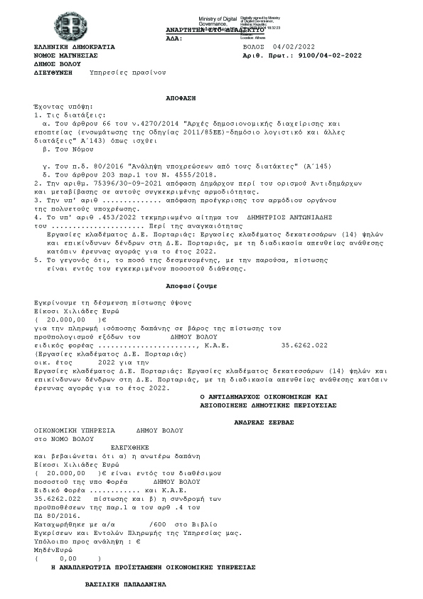 Τη ρήση «λεφτά υπάρχουν» μας θυμίζει ο Δήμος Βόλου, ο οποίος θα διαθέσει το ιλιγγιώδες ποσό των 20.000 ευρώ απλώς για να κλαδέψει μόλις 14 δέντρα! Σύμφωνα με απόφαση που αναρτήθηκε στη «Διαύγεια» ο Δήμος Βόλου θα διαθέσει το ποσό για «εργασίες κλαδέματος δεκατεσσάρων (14) ψηλών και επικίνδυνων δένδρων στη Δ.Ε. Πορταριάς, με τη διαδικασία απευθείας ανάθεσης κατόπιν έρευνας αγοράς». Αν δεν ήταν τόσο πρόσφατη η είδηση ότι ο Βόλος κατατάσσεται τελευταίος ανάμεσα σε αρκετές άλλες πόλεις της Ελλάδας, σε ότι αφορά στην κάλυψή του σε αστικό πράσινο, ίσως και το συγκεκριμένο θέμα να περνούσε στα «ψιλά». Ωστόσο εδώ φαίνεται ότι οι προτεραιότητες της Δημοτικής Αρχής Μπέου δεν περιλαμβάνουν την φύτευση περισσότερων δέντρων και την επέκταση του αστικού πρασίνου, παρά επικεντρώνονται διαρκώς στο κλάδεμα και την φύτευση εποχιακών λουλουδιών.
